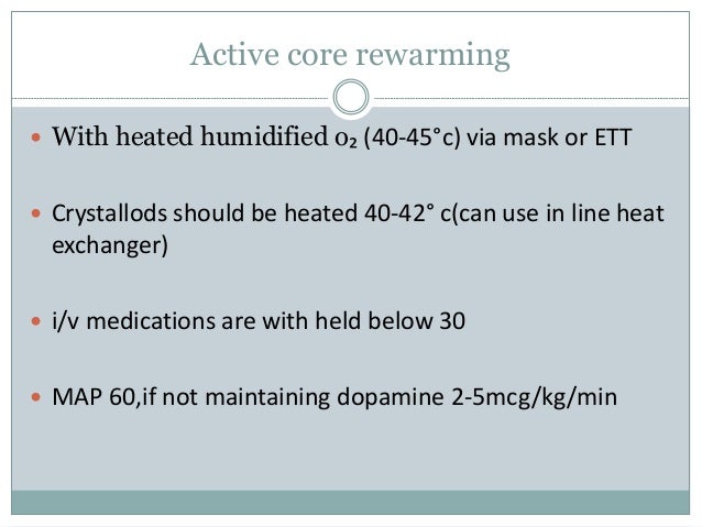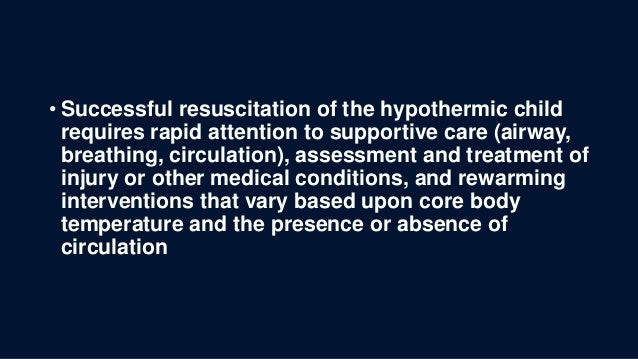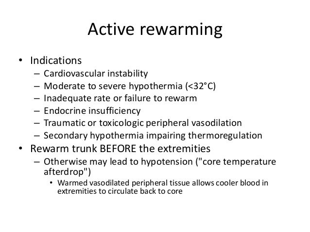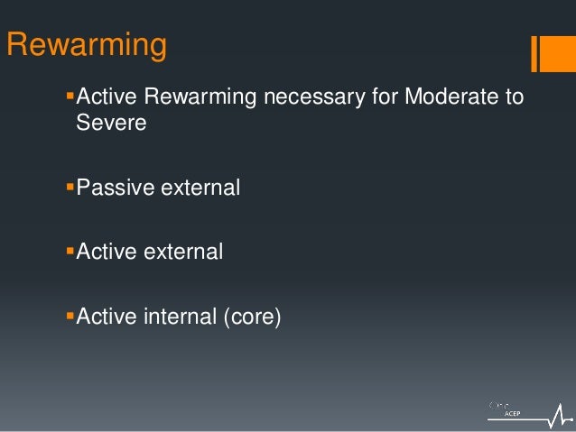 That forced air rewarming (one study used warmed IV fluids and forced air rewarming) is effective in some patients, even those with severe hypothermia.7,8 –For patients with a core body temperature 30°C (86°F) and cardiac arrest, active internal rewarming techniques ... Read Here